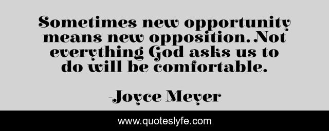 This page presents the quote "Sometimes new opportunity means new opposition. Not everything God asks us to do will be comfortable.". Author of this quote is Joyce Meyer. This quote is about faith, god, trials,.