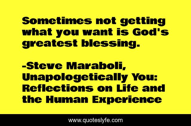 This page presents the quote "Sometimes not getting what you want is God's greatest blessing.". Author of this quote is Steve Maraboli, Unapologetically You: Reflections on Life and the Human Experience. This quote is about god, blessing, prayer,.