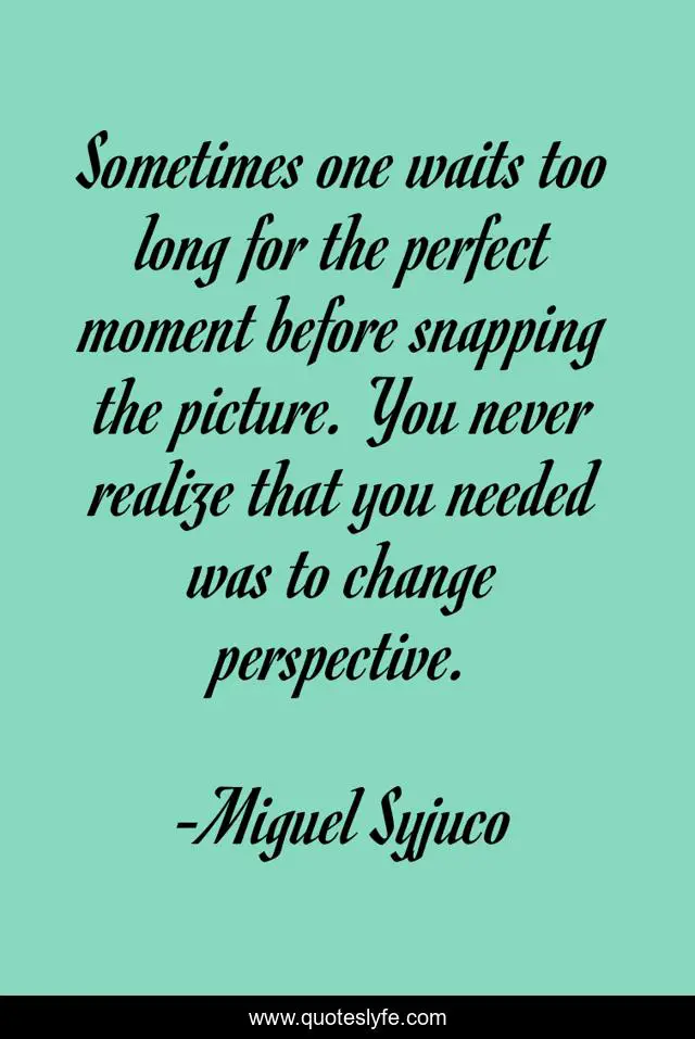 This page presents the quote "Sometimes one waits too long for the perfect moment before snapping the picture. You never realize that you needed was to change perspective.". Author of this quote is Miguel Syjuco. This quote is about patience, photography, perspective,.
