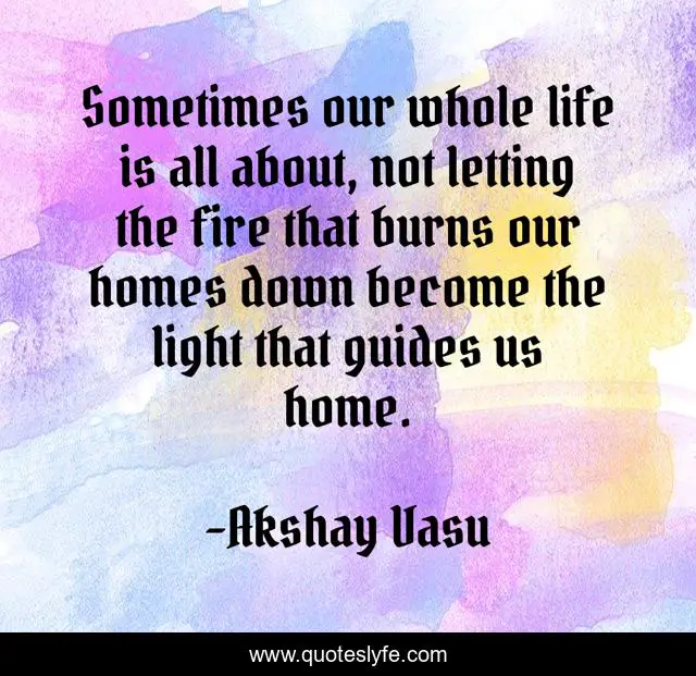 This page presents the quote "Sometimes our whole life is all about, not letting the fire that burns our homes down become the light that guides us home.". Author of this quote is Akshay Vasu. This quote is about fire, light, burn, down, home, guide,.