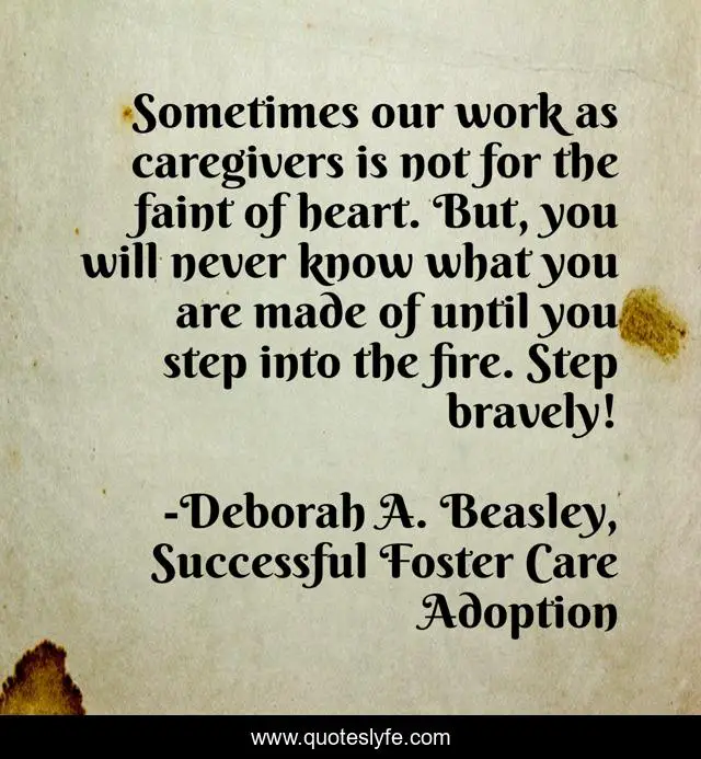 This page presents the quote "Sometimes our work as caregivers is not for the faint of heart. But, you will never know what you are made of until you step into the fire. Step bravely!". Author of this quote is Deborah A. Beasley, Successful Foster Care Adoption. This quote is about parenting, discouraged, parenting-tip, encouragement, wisdom,.
