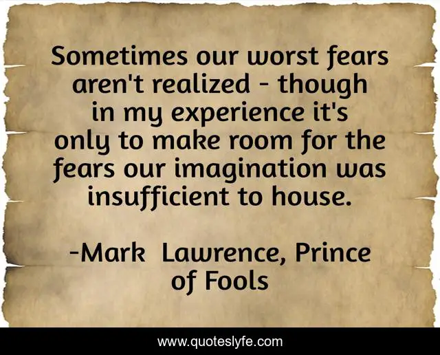 This page presents the quote "Sometimes our worst fears aren't realized - though in my experience it's only to make room for the fears our imagination was insufficient to house.". Author of this quote is Mark Lawrence, Prince of Fools. This quote is about house, fears, experience, imagination,.