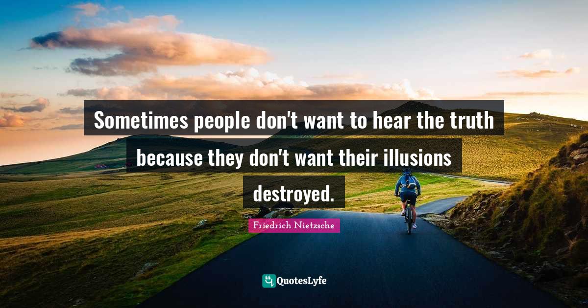 This page presents the quote "Sometimes people don't want to hear the truth because they don't want their illusions destroyed.". Author of this quote is Friedrich Nietzsche. This quote is about sometimes, people, inspirational, destroyed, truth, want,.