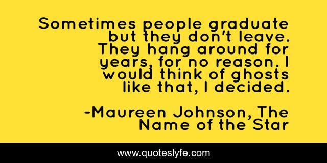 This page presents the quote "Sometimes people graduate but they don't leave. They hang around for years, for no reason. I would think of ghosts like that, I decided.". Author of this quote is Maureen Johnson, The Name of the Star. This quote is about letting-go, alumni, ghosts, college,.