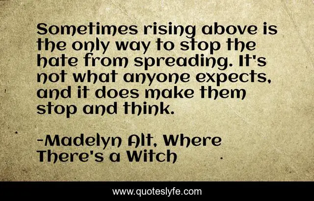 This page presents the quote "Sometimes rising above is the only way to stop the hate from spreading. It's not what anyone expects, and it does make them stop and think.". Author of this quote is Madelyn Alt, Where There's a Witch. .
