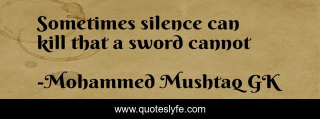 This page presents the quote "Sometimes silence can kill that a sword cannot". Author of this quote is Mohammed Mushtaq GK. This quote is about confidence, positive, motivational, kill, harmony, inspirational, enthusiasm, silence, optimistic,.