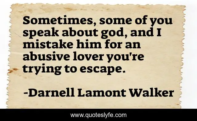 This page presents the quote "Sometimes, some of you speak about god, and I mistake him for an abusive lover you're trying to escape.". Author of this quote is Darnell Lamont Walker. This quote is about god, abusive-relationships, abuse, religion,.