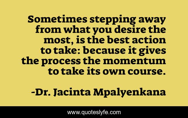 This page presents the quote "Sometimes stepping away from what you desire the most, is the best action to take: because it gives the process the momentum to take its own course.". Author of this quote is Dr. Jacinta Mpalyenkana. This quote is about enthusiasm, actions, inspirational, patience-and-love,.