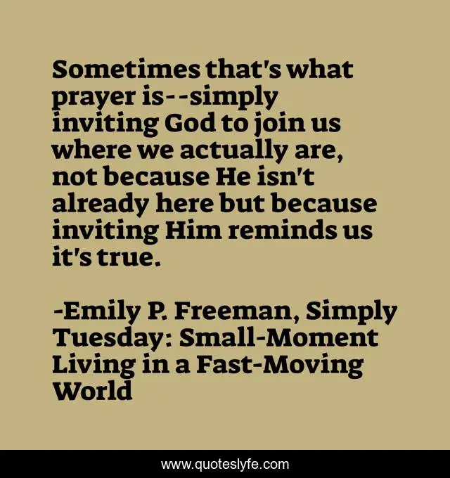"Emily P. Freeman, Simply Tuesday: Small-Moment Living in a Fast-Moving World Quotes." Quoteslyfe.com, 2025. Fri. 05 Dec. 2025. <https://www.quoteslyfe.com/quote/Sometimes-that-s-what-prayer-is-simply-62390>.