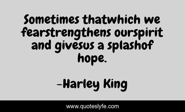 This page presents the quote "Sometimes thatwhich we fearstrengthens ourspirit and givesus a splashof hope.". Author of this quote is Harley King. This quote is about splash, fear, strength, spirit, hope,.