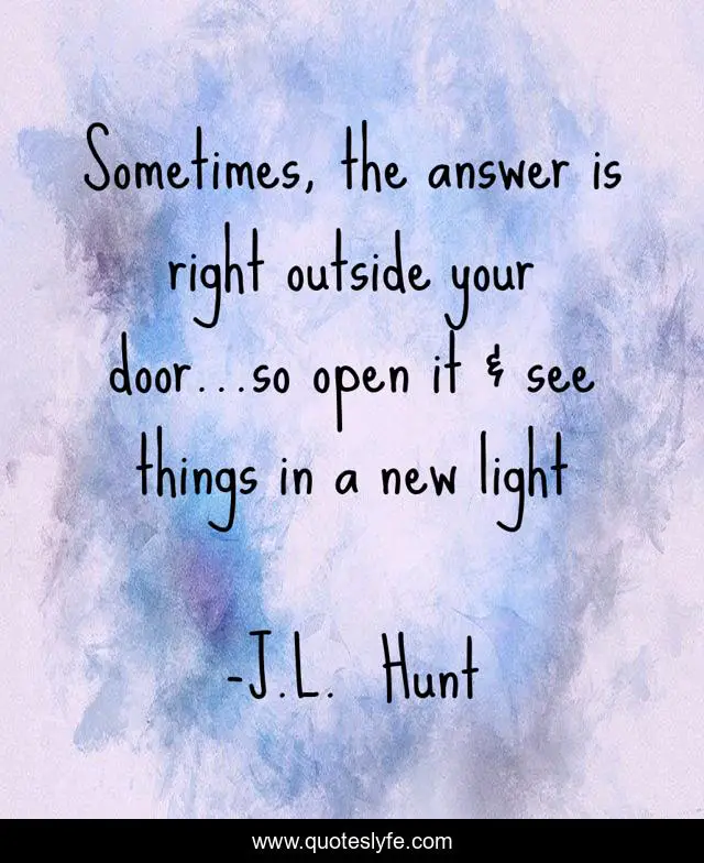 This page presents the quote "Sometimes, the answer is right outside your door...so open it & see things in a new light". Author of this quote is J.L. Hunt. This quote is about positive-mindset, positive, motivational-for-women, motivational, self-love, self-esteem-self-help-book, inspirational-attitude, opportunities-in-life, inspirational,.