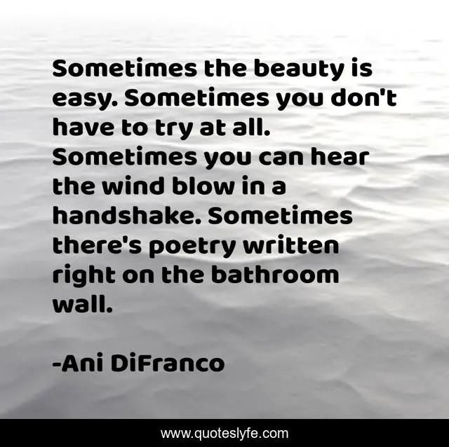 This page presents the quote "Sometimes the beauty is easy. Sometimes you don't have to try at all. Sometimes you can hear the wind blow in a handshake. Sometimes there's poetry written right on the bathroom wall.". Author of this quote is Ani DiFranco. This quote is about wind, poetry, easy,.