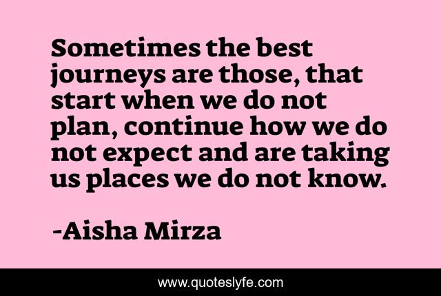 This page presents the quote "Sometimes the best journeys are those, that start when we do not plan, continue how we do not expect and are taking us places we do not know.". Author of this quote is Aisha Mirza. This quote is about development, life, growth, journey-of-life, self-help,.