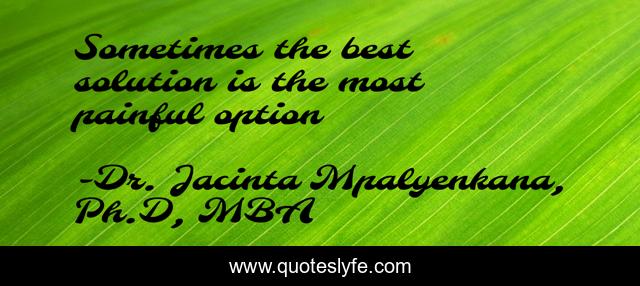 This page presents the quote "Sometimes the best solution is the most painful option". Author of this quote is Dr. Jacinta Mpalyenkana, Ph.D, MBA. This quote is about inspirational-life, solutions-to-your-problems, decisions-inspirational, life-lessons,.