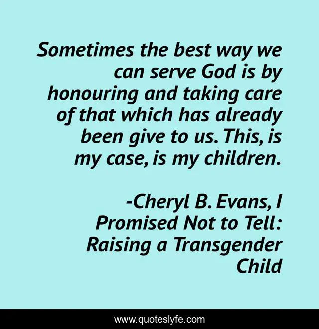This page presents the quote "Sometimes the best way we can serve God is by honouring and taking care of that which has already been give to us. This, is my case, is my children.". Author of this quote is Cheryl B. Evans, I Promised Not to Tell: Raising a Transgender Child. This quote is about faith, lgbtq, memoir, god, parenting,.