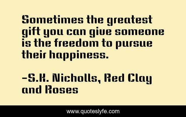 This page presents the quote "Sometimes the greatest gift you can give someone is the freedom to pursue their happiness.". Author of this quote is S.K. Nicholls, Red Clay and Roses. This quote is about gifts, freedom, romance-gone-wrong, happiness, letting-go,.