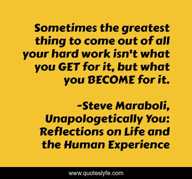 This page presents the quote "Sometimes the greatest thing to come out of all your hard work isn't what you GET for it, but what you BECOME for it.". Author of this quote is Steve Maraboli, Unapologetically You: Reflections on Life and the Human Experience. This quote is about enthusiasm, life, hard-work, inspirational, success,.