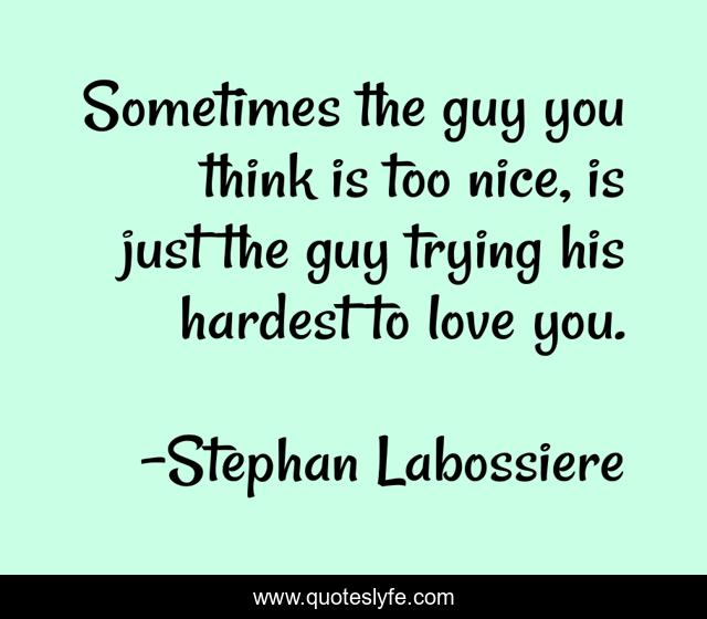 This page presents the quote "Sometimes the guy you think is too nice, is just the guy trying his hardest to love you.". Author of this quote is Stephan Labossiere. This quote is about relationships, love, dating, too-nice, affection,.