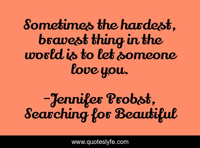 This page presents the quote "Sometimes the hardest, bravest thing in the world is to let someone love you.". Author of this quote is Jennifer Probst, Searching for Beautiful. This quote is about hard, brave, love, affection,.