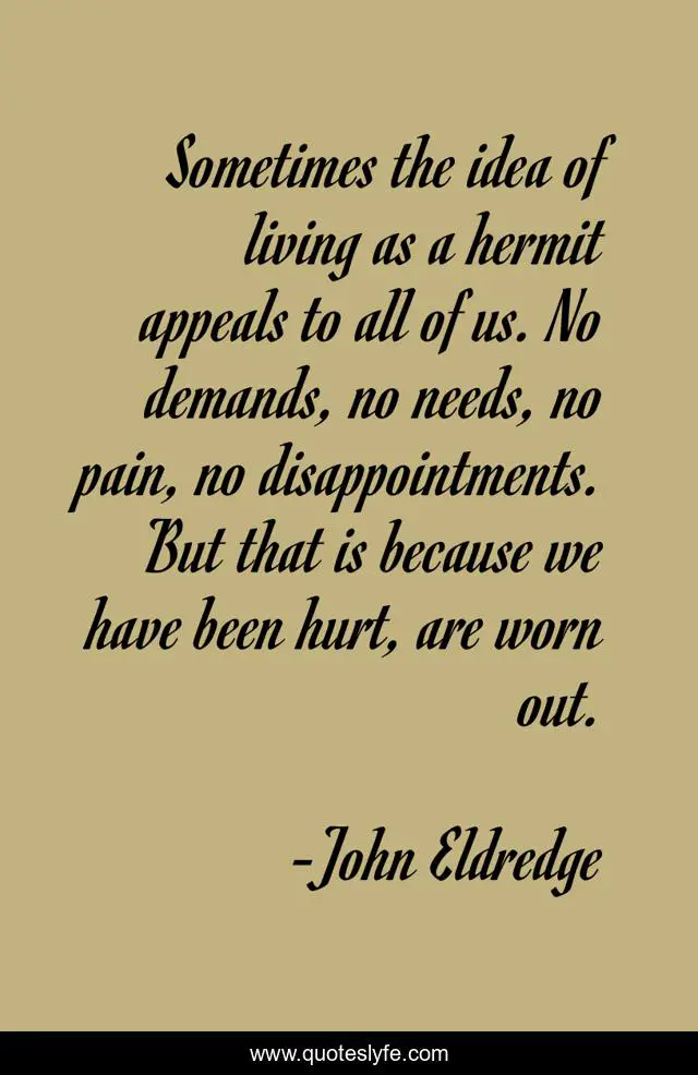 This page presents the quote "Sometimes the idea of living as a hermit appeals to all of us. No demands, no needs, no pain, no disappointments. But that is because we have been hurt, are worn out.". Author of this quote is John Eldredge. This quote is about needs, woman, pain, demands, womanhood, disappointments, hurt, worn-out, hermit,.