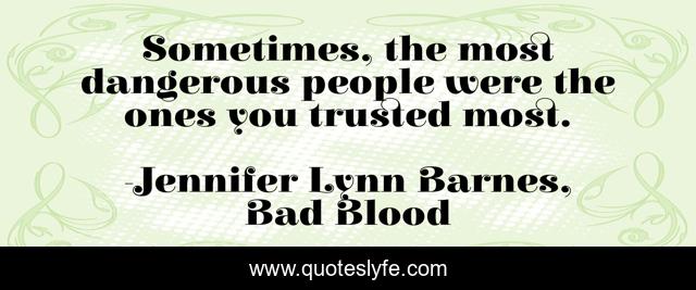 This page presents the quote "Sometimes, the most dangerous people were the ones you trusted most.". Author of this quote is Jennifer Lynn Barnes, Bad Blood. This quote is about mgg, danger, jennifer-lynn-barnes, the-naturals, trust, bad-blood,.