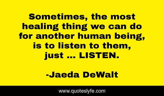 This page presents the quote "Sometimes, the most healing thing we can do for another human being, is to listen to them, just ... LISTEN.". Author of this quote is Jaeda DeWalt. This quote is about wise-words, inspirational, wisdom, healing, listening, enthusiasm, human-being, being-supportive, listen,.