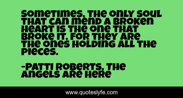 This page presents the quote "Sometimes, the only soul that can mend a broken heart is the one that broke it. For they are the ones holding all the pieces.". Author of this quote is Patti Roberts, The Angels Are Here. This quote is about broken-heart, heart, love, soul, affection,.