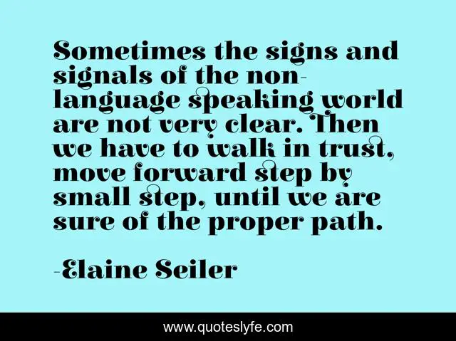 This page presents the quote "Sometimes the signs and signals of the non-language speaking world are not very clear. Then we have to walk in trust, move forward step by small step, until we are sure of the proper path.". Author of this quote is Elaine Seiler. This quote is about self-help, metaphysical, inspirational, universe-gigantic-power, enthusiasm, trust, energetics,.