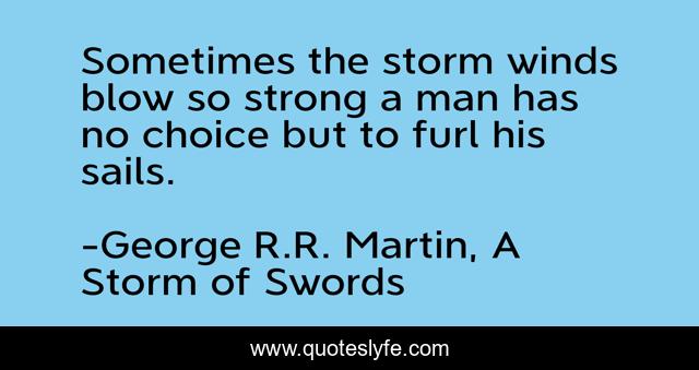 This page presents the quote "Sometimes the storm winds blow so strong a man has no choice but to furl his sails.". Author of this quote is George R.R. Martin, A Storm of Swords. This quote is about sea, sail, storm, winds, ship, strong, furl,.