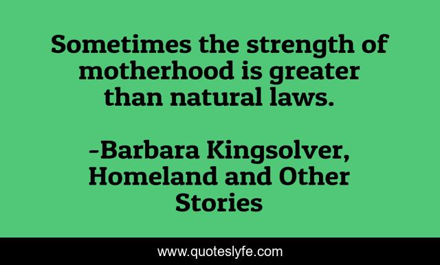 This page presents the quote "Sometimes the strength of motherhood is greater than natural laws.". Author of this quote is Barbara Kingsolver, Homeland and Other Stories. This quote is about motherhood, parenting,.