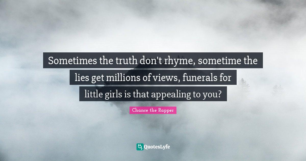 This page presents the quote "Sometimes the truth don't rhyme, sometime the lies get millions of views, funerals for little girls is that appealing to you?". Author of this quote is Chance the Rapper. This quote is about sometimes, millions, rhyme, truth, girl, lying, views,.