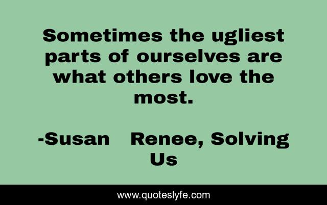 This page presents the quote "Sometimes the ugliest parts of ourselves are what others love the most.". Author of this quote is Susan Renee, Solving Us. This quote is about body-image, love, inspirational, enthusiasm, affection, self-esteem,.