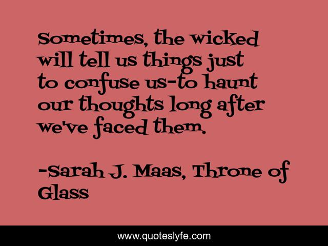 This page presents the quote "Sometimes, the wicked will tell us things just to confuse us–to haunt our thoughts long after we've faced them.". Author of this quote is Sarah J. Maas, Throne of Glass. This quote is about throne-of-glass, good-and-evil, sarah-j-maas,.