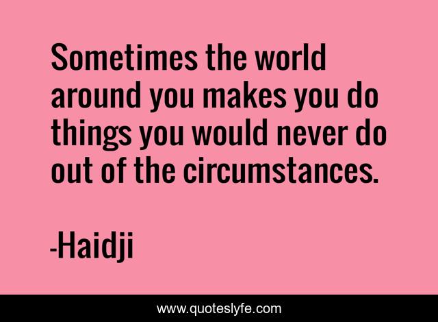 This page presents the quote "Sometimes the world around you makes you do things you would never do out of the circumstances.". Author of this quote is Haidji. This quote is about behaviour, attitude, haidji, life, inspiration,.