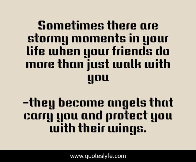 This page presents the quote "Sometimes there are stormy moments in your life when your friends do more than just walk with you". Author of this quote is they become angels that carry you and protect you with their wings.. This quote is about steve maraboli, unapologetically you: reflections on life and the human experience,.