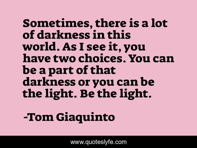 This page presents the quote "Sometimes, there is a lot of darkness in this world. As I see it, you have two choices. You can be a part of that darkness or you can be the light. Be the light.". Author of this quote is Tom Giaquinto. This quote is about motivation, good, goodness, becoming-better, positive, human, motivational, confidence, humanity,.