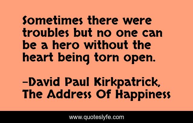 This page presents the quote "Sometimes there were troubles but no one can be a hero without the heart being torn open.". Author of this quote is David Paul Kirkpatrick, The Address Of Happiness. This quote is about trouble, hero,.