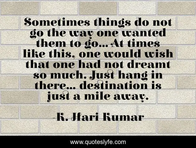 This page presents the quote "Sometimes things do not go the way one wanted them to go... At times like this, one would wish that one had not dreamt so much. Just hang in there... destination is just a mile away.". Author of this quote is K. Hari Kumar. This quote is about azquotes, inspirational-attitude, inspirational, inspirational-life, enthusiasm, depression-recovery, depression,.