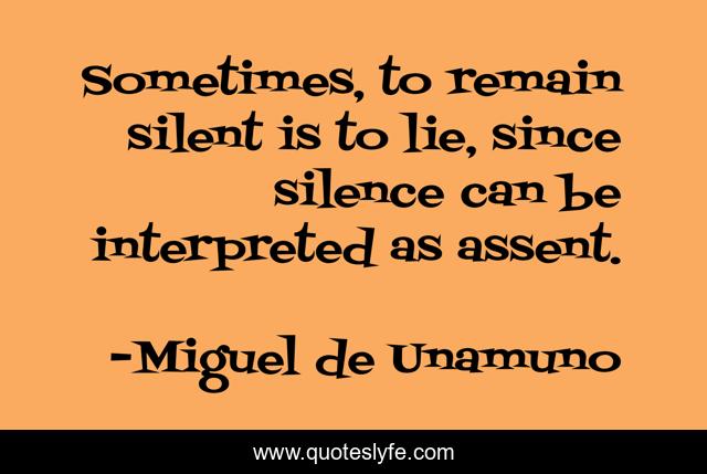 This page presents the quote "Sometimes, to remain silent is to lie, since silence can be interpreted as assent.". Author of this quote is Miguel de Unamuno. This quote is about assent, silence,.