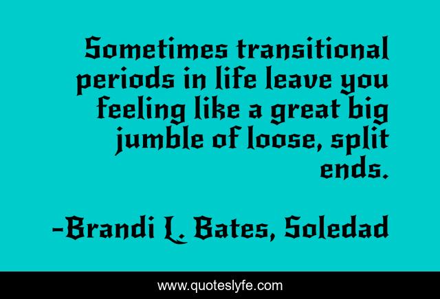 This page presents the quote "Sometimes transitional periods in life leave you feeling like a great big jumble of loose, split ends.". Author of this quote is Brandi L. Bates, Soledad. This quote is about motivation, success, brandi-bates, albert-einstein-life, life, wisdom, truth-to-power, life-lessons, opulence,.