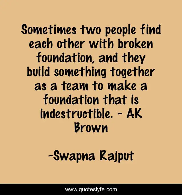 This page presents the quote "Sometimes two people find each other with broken foundation, and they build something together as a team to make a foundation that is indestructible. - AK Brown". Author of this quote is Swapna Rajput. This quote is about quotes, lovequotes,.
