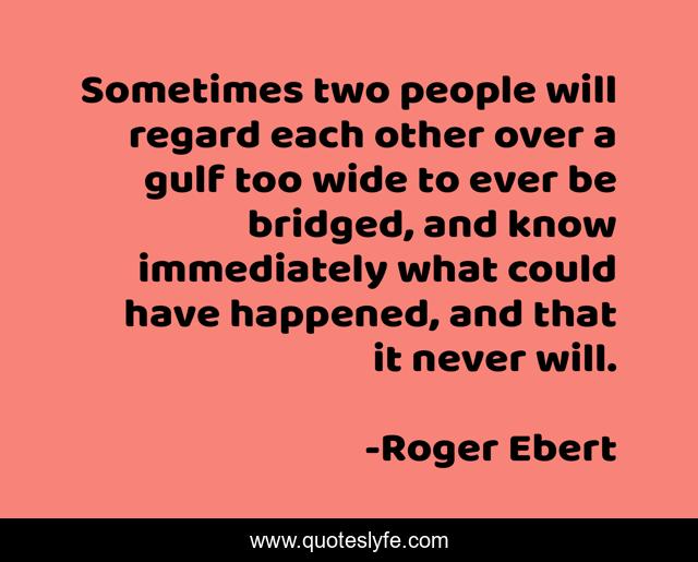 This page presents the quote "Sometimes two people will regard each other over a gulf too wide to ever be bridged, and know immediately what could have happened, and that it never will.". Author of this quote is Roger Ebert. This quote is about sadness, sad-but-true, love, affection,.