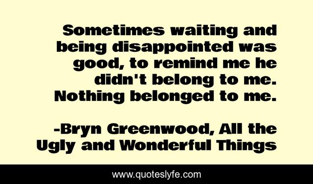 This page presents the quote "Sometimes waiting and being disappointed was good, to remind me he didn't belong to me. Nothing belonged to me.". Author of this quote is Bryn Greenwood, All the Ugly and Wonderful Things. This quote is about waiting, belong, disappointment,.