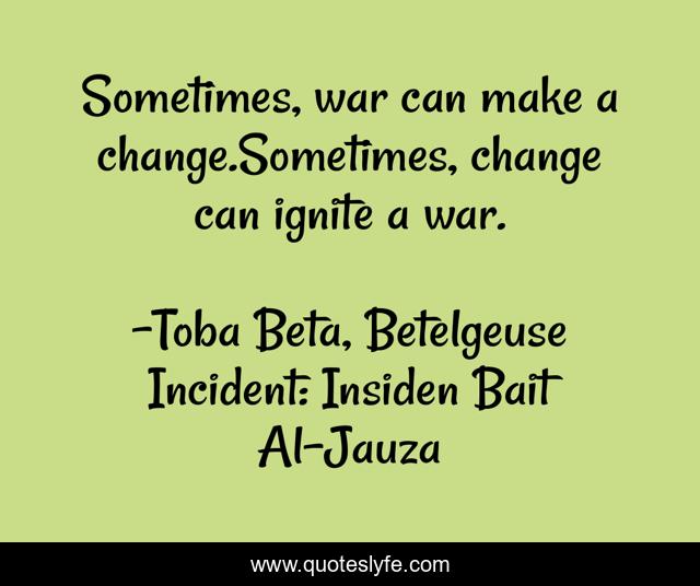 This page presents the quote "Sometimes, war can make a change.Sometimes, change can ignite a war.". Author of this quote is Toba Beta, Betelgeuse Incident: Insiden Bait Al-Jauza. This quote is about war, change,.