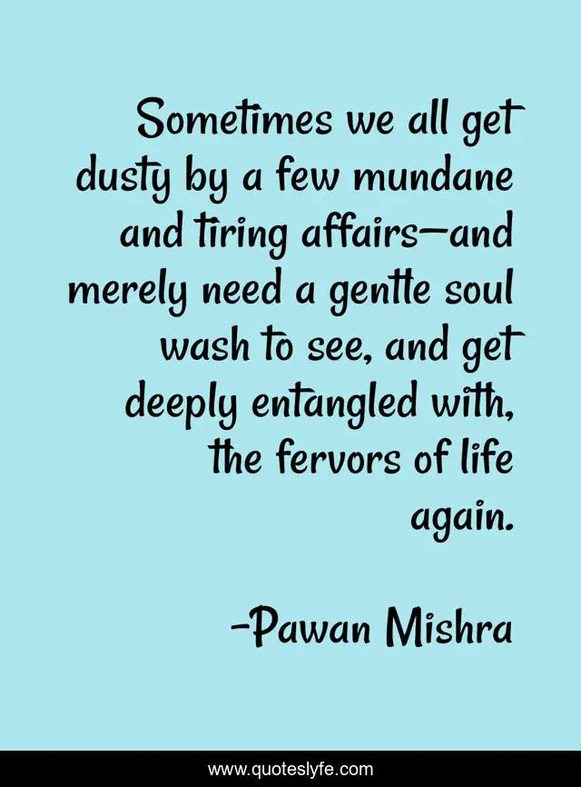 This page presents the quote "Sometimes we all get dusty by a few mundane and tiring affairs—and merely need a gentle soul wash to see, and get deeply entangled with, the fervors of life again.". Author of this quote is Pawan Mishra. This quote is about love, mundane-life, new-year-resolutions, soul, blind-spots, reality, self-realization, perspective, life-lessons,.