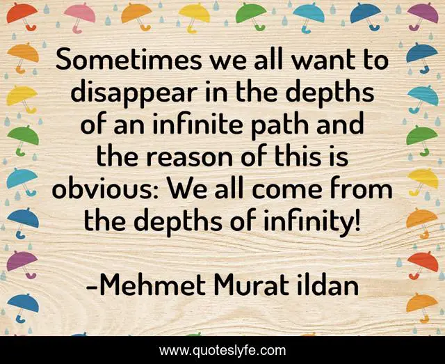 This page presents the quote "Sometimes we all want to disappear in the depths of an infinite path and the reason of this is obvious: We all come from the depths of infinity!". Author of this quote is Mehmet Murat ildan. This quote is about paths, depths, mehmet-murat-ildan, ildan-wise-sayings, disappearance, ildan-wisdom, turkish, turkish-playwrights, turkish-wisdom-words,.