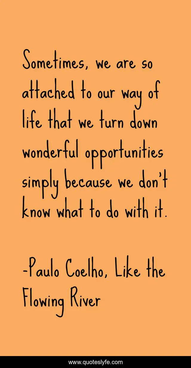 This page presents the quote "Sometimes, we are so attached to our way of life that we turn down wonderful opportunities simply because we don't know what to do with it.". Author of this quote is Paulo Coelho, Like the Flowing River. This quote is about enthusiasm, inspirational,.