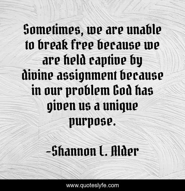 This page presents the quote "Sometimes, we are unable to break free because we are held captive by divine assignment because in our problem God has given us a unique purpose.". Author of this quote is Shannon L. Alder. This quote is about assignment, naaman, acceptance, purpose, bible,.