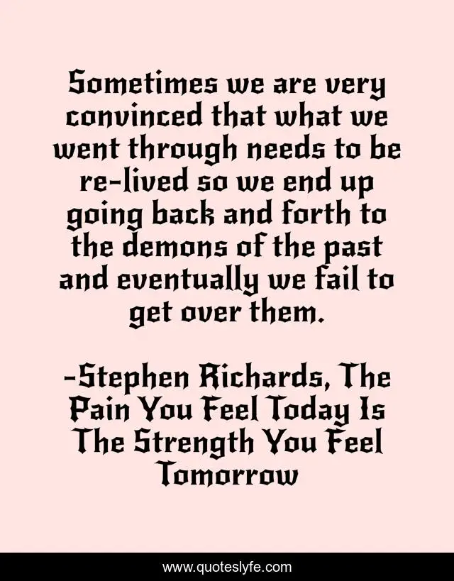 This page presents the quote "Sometimes we are very convinced that what we went through needs to be re-lived so we end up going back and forth to the demons of the past and eventually we fail to get over them.". Author of this quote is Stephen Richards, The Pain You Feel Today Is The Strength You Feel Tomorrow. This quote is about empowering, confidence, moving-on-and-letting-go, healing-the-past, motivational, forgive, stephen-richards-author, stephen-richards, suffering,.