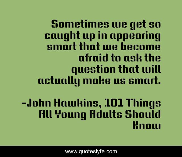 This page presents the quote "Sometimes we get so caught up in appearing smart that we become afraid to ask the question that will actually make us smart.". Author of this quote is John Hawkins, 101 Things All Young Adults Should Know. This quote is about ignorant, intelligent, questions, smart, question,.